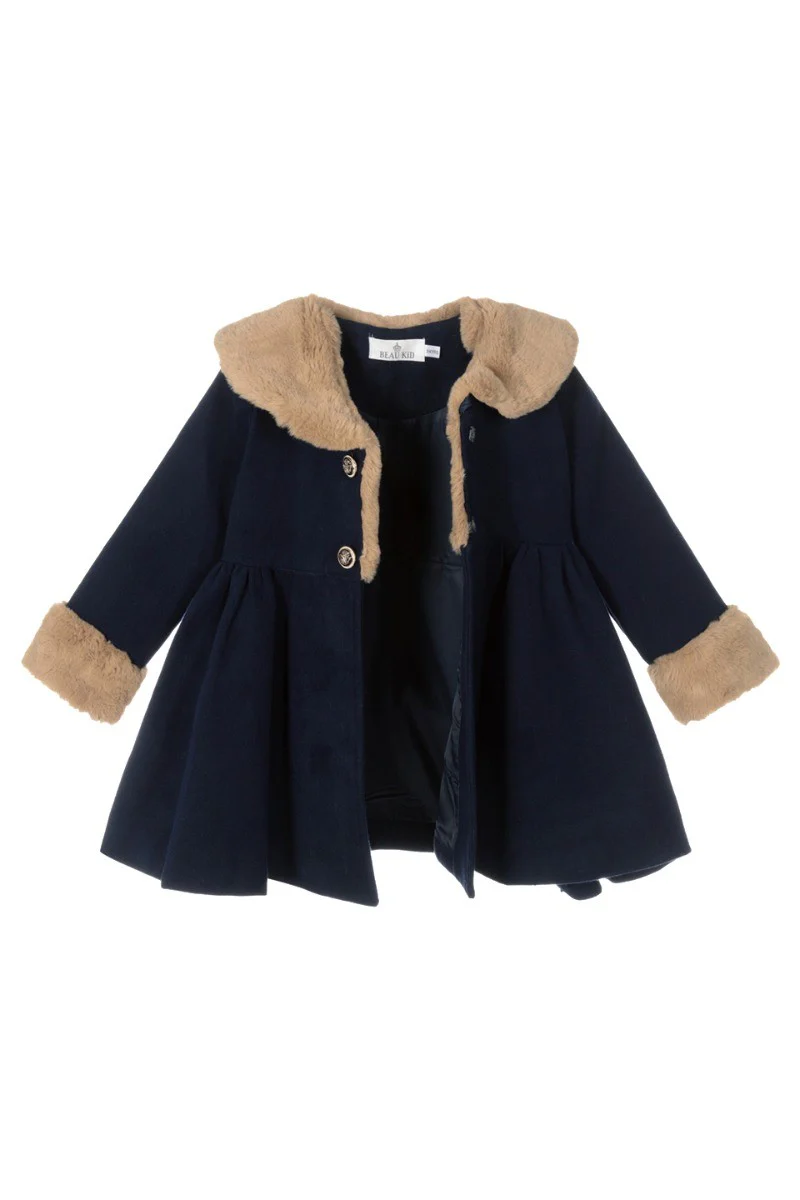 Girls Fur Midi Dress Coat 2 Piece Set - Navy Blue