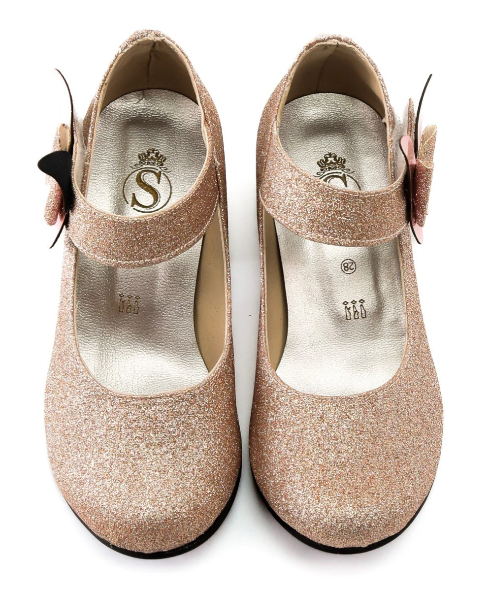 Girls Sparkly Block Heel Mary Janes with Butterfly Applique – Glittery Flower Girl Bridesmaid Shoes