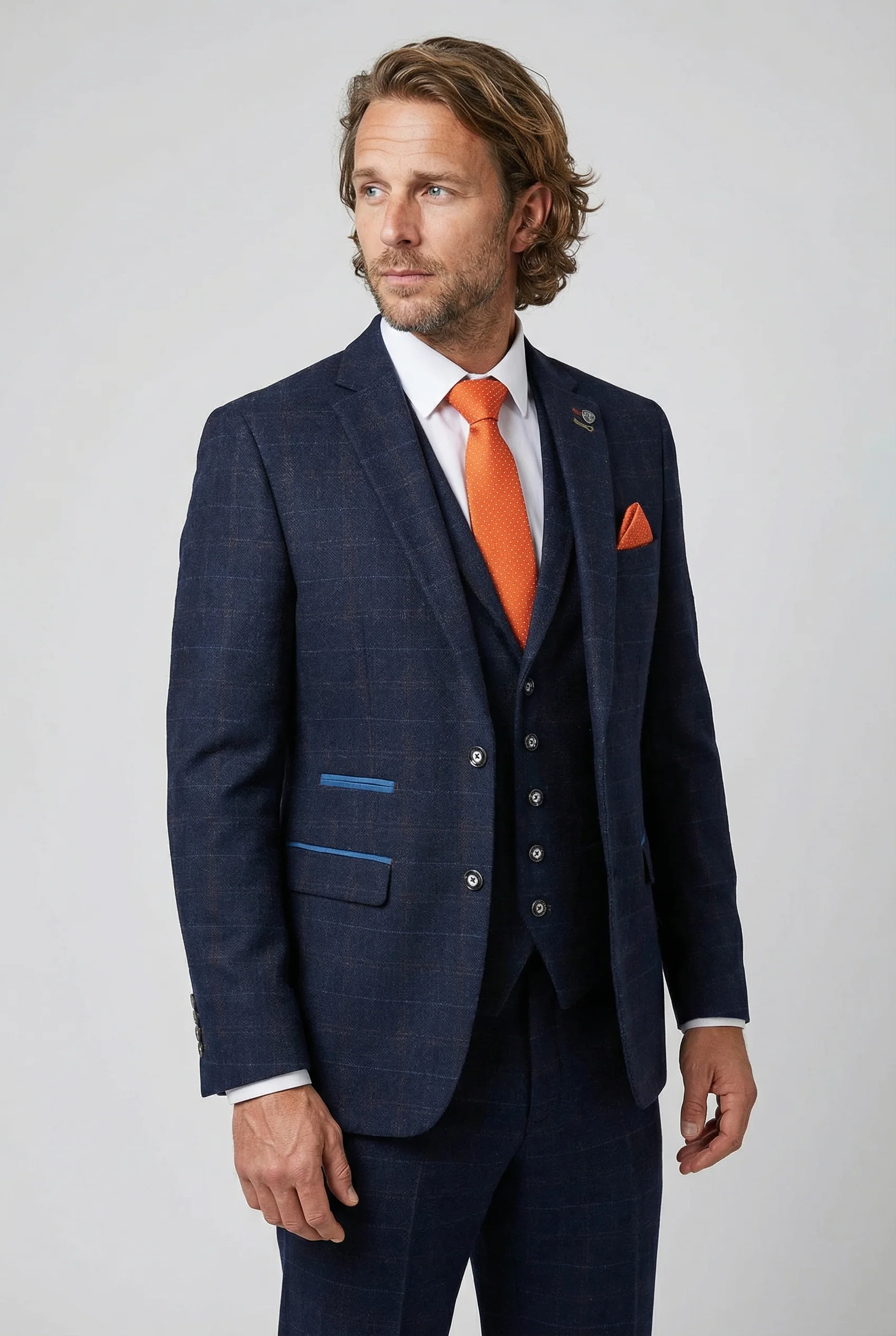 Men's Tweed Windowpane Tailored Fit Navy Suit - RYAN - Navy Blue